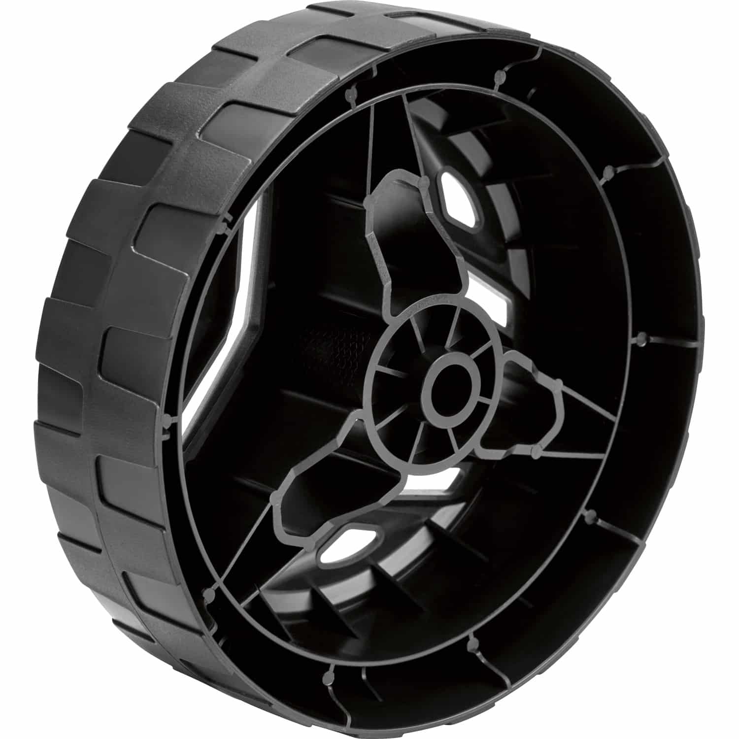 Das Rad besteht aus einem hochwertigen, UV-beständigen Kunststoff, typischerweise einer Form von Polypropylen (PP) oder ABS-Verbund. Die Lauffläche ist ebenfalls aus strapazierfähigem Kunststoff gefertigt, der für gute Traktion auf Rasenflächen ausgelegt ist.